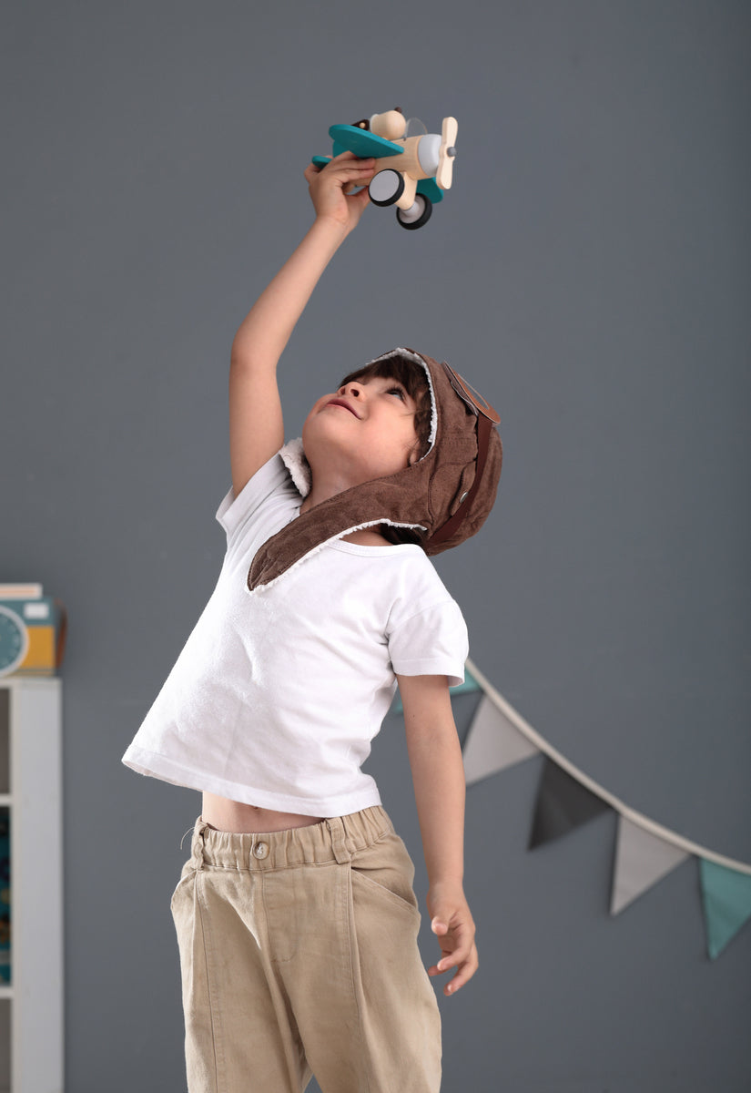 Medium sized, natural timber, retro styled, single wing plane with cute dog driver and rubberised wheels. Kids will have a ball imagining the stunts this daredevil pilot could do. Beautiful, yet sturdy enough to play with.
