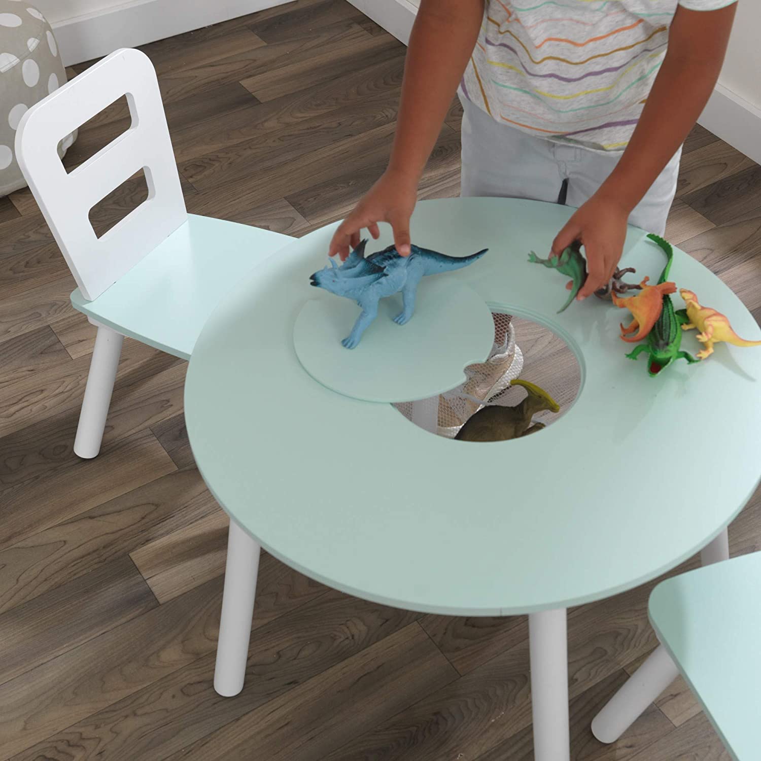 - Our Round Table & 2-Chair Set is a sturdy furniture set that also provides plenty of convenient storage space. "Convenient" is the key word here - kids just have to lift up the lightweight middle piece and they can push all of their toys into the attached net. It's just like magic!