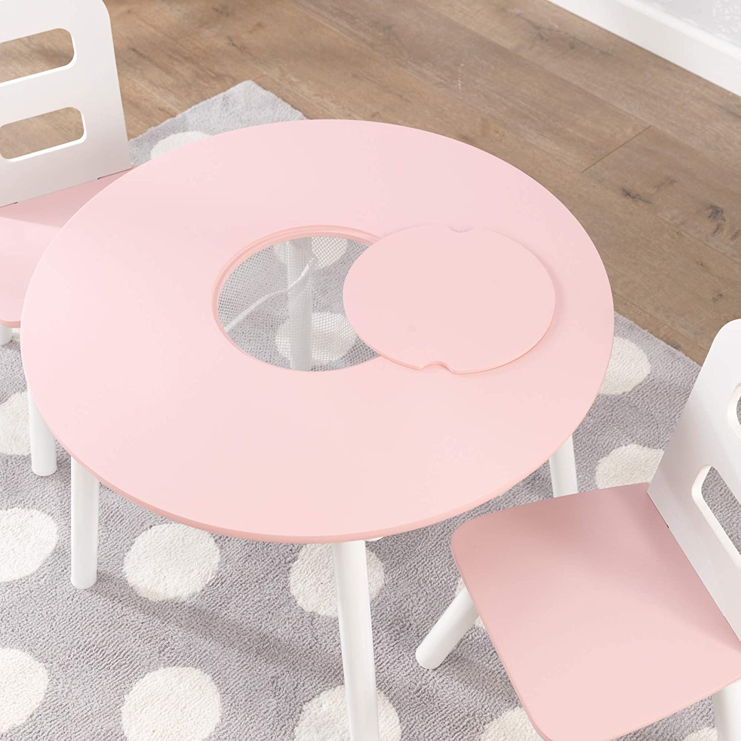 • Our Round Table & 2-Chair Set is a sturdy furniture set that also provides plenty of convenient storage space. "Convenient" is the key word here - kids just have to lift up the lightweight middle piece and they can push all of their toys into the attached net. It's just like magic!