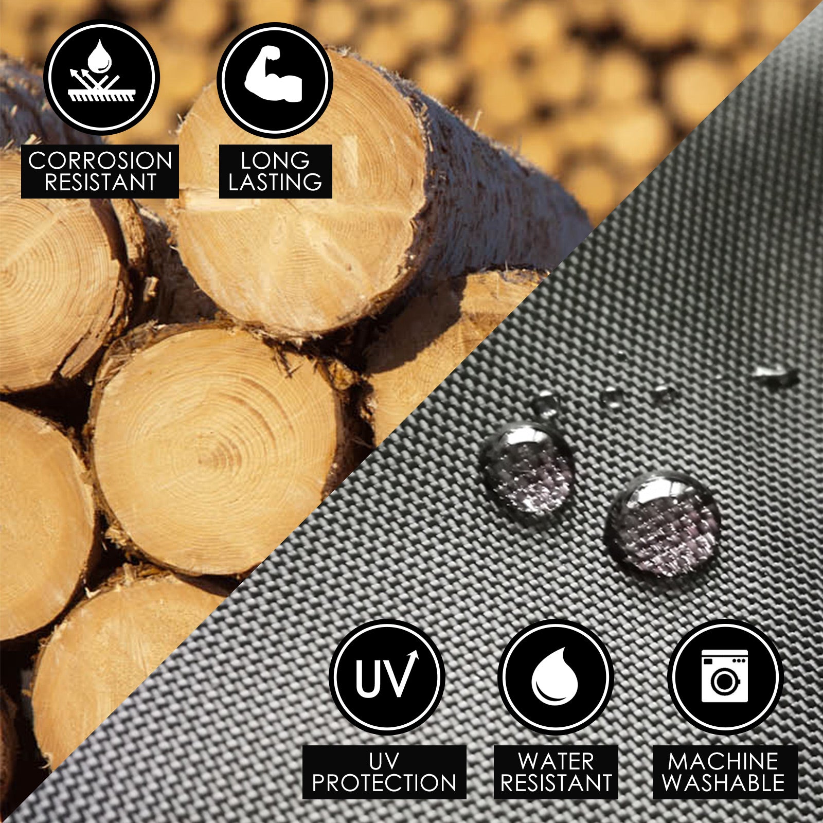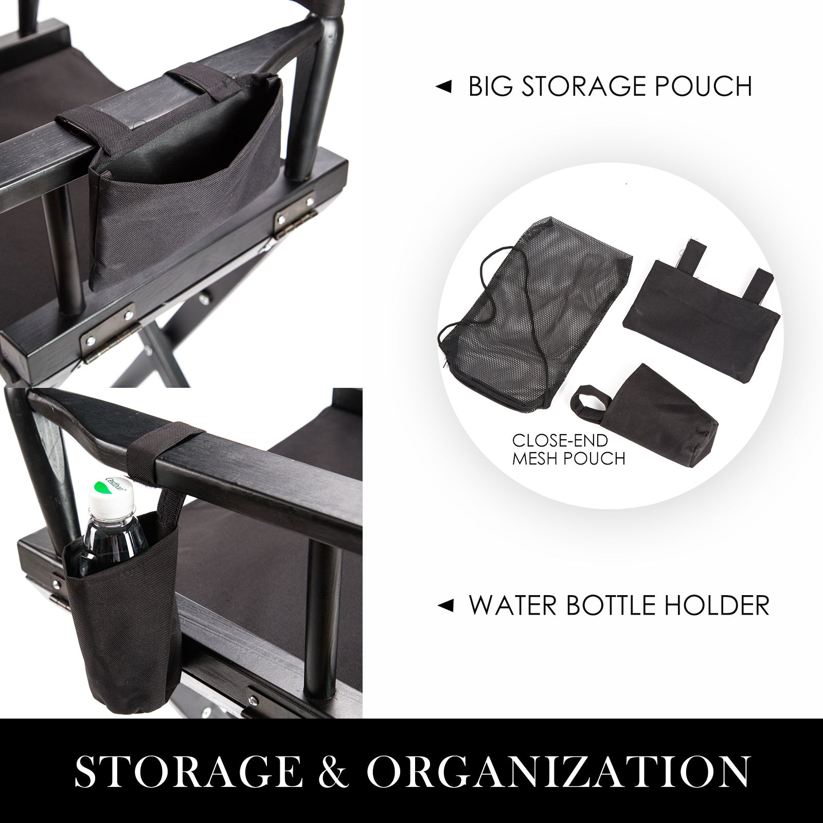 Crafted from durable beech wood with a glamorous black finish, it adopts high-strength material and delicate workmanship to ensure excellent quality and durability. The snag-resistant backrest and seat are made of heavy-duty 600D Oxford fabric for all-weather use and can be easily removed for cleaning. Foldable design makes it room-saving when not in use; and also convenient for carrying. It is equipped with a footrest for comfort. Besides, there are two detachable side bags and large storage for your beverages or work essentials. It is really ideal for makeup! And when it's a wrap, just fold the lightweight Chair away for easy transport or storage.