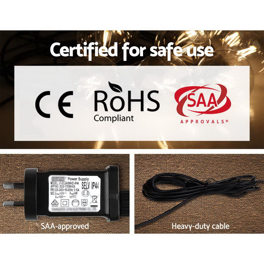 Our Jingle Jollys Festoon String Lights are great not only for wedding and birthday parties or special events, but also for creating a warm, inviting ambience with its bright and mellow glow. Suitable for both indoor and outdoor use, its IP44 rating means that it can be used in the rain and all weather conditions. Each bulb draws a very low voltage and is placed 90cm equally apart from each other throughout its 41m length for an even distribution of illumination and brightness. Not least, the each bulb has a 20,000 hours lifespan so that you can get to use the string lights for quite a while.