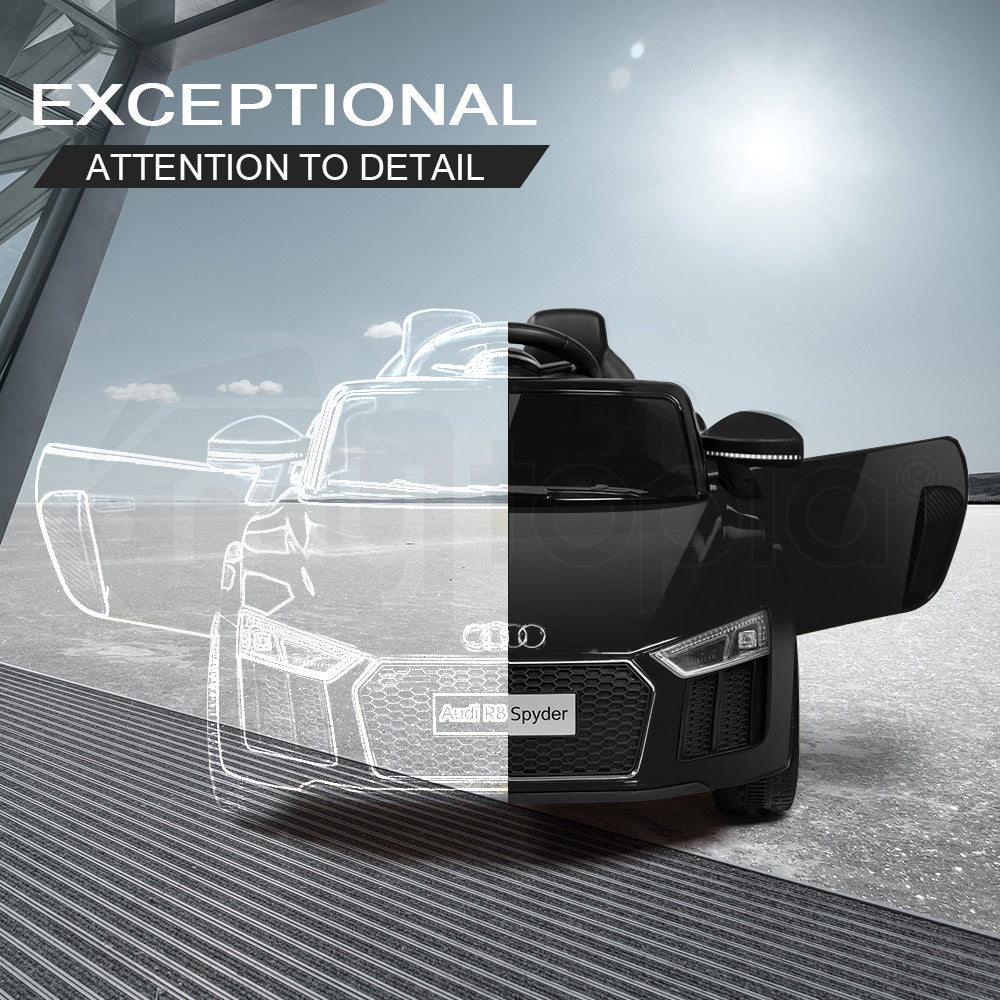 Presenting the R8 Spyder Ride-On Car, licensed by Audi. In the true spirit of the iconic sports car, this model boasts of luxurious and sporty detailing that characterise the actual full-size car. The headlights and rear lights, designed with unequivocally intricate detailing, light up along with the dashboard and gear selection.