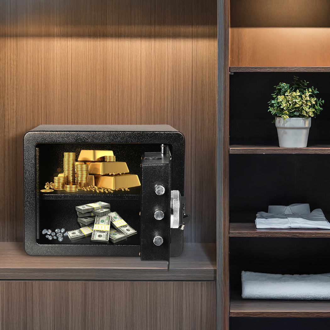 Protect your valuables with this secure digital safe – the perfect safe box for cash, documents, jewelry, and more! Whether you're looking for a small safe to store your money, a gun safe to keep firearms secure, or a fireproof safe to protect important documents from fire damage, this security box has you covered. It features an easy-to-use key safe system and a robust lock box design, making it an ideal choice for home, office, or travel. Keep your peace of mind knowing your most valuable items are locked up tight in this durable, fireproof document box. This money safe is a must-have for anyone who values security and protection – get yours today and experience the ultimate in safe storage!