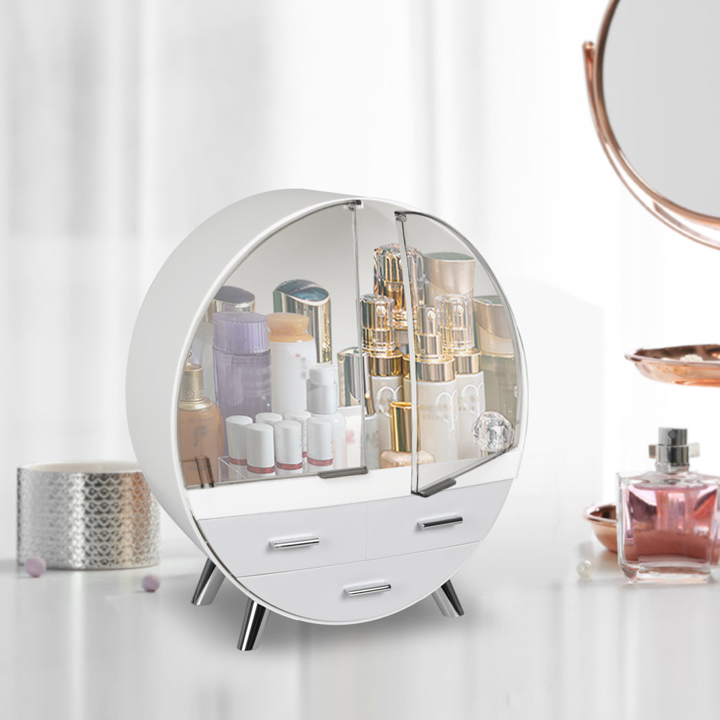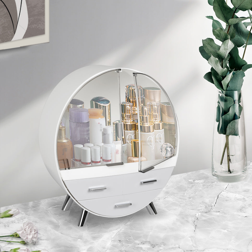 Slide out the drawers in your vanity case. Store jewellery and brushes in the drawers. Keep your lipstick, mascara, and other makeup in the tall top section. Keep your counter clear.